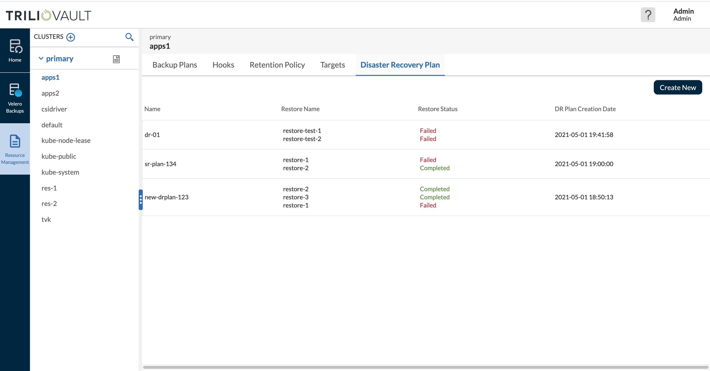 Users can monitor the status of the DRPlan from the resource management tab itself and can look at the status of individual restores from the restore overview page.