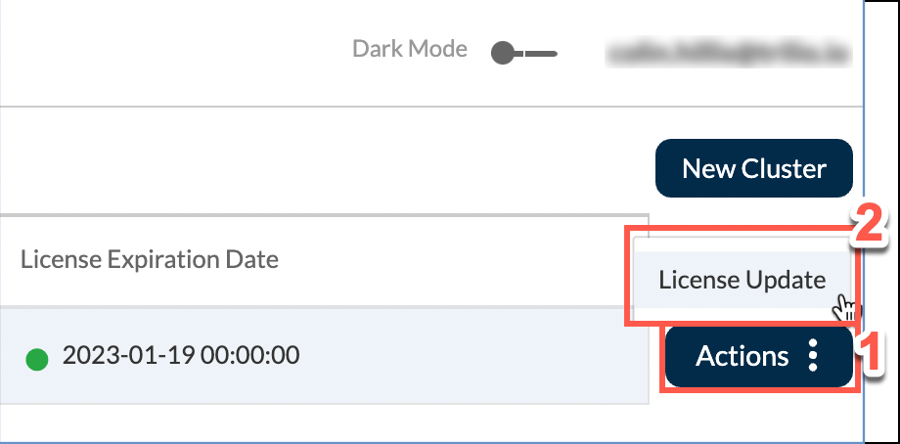 The Actions button (field/button 5 in the image above) provides a dropdown menu of actions that a user can take in relation to the cluster selected. Currently the only option available is License Update, but this is likely to extend in the future. Follow the guidance below for each of the actions available.