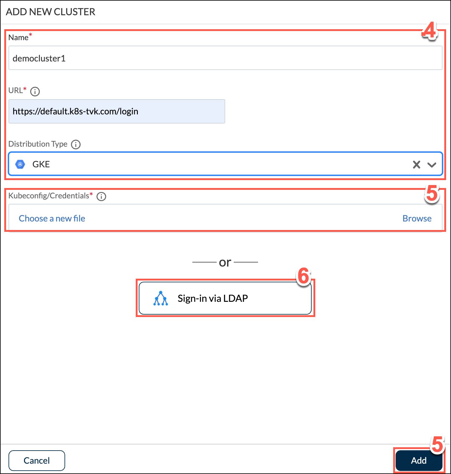 On the Cluster Management (Home) page, users can add and navigate clusters. T4K supports authentication via KubeConfig files and via Dex, which is an identity service IDP plugin for other identity providers. Below is the step-by-step guide to add clusters using LDAP and OIDC (Google SSO) authentications. Refer to documentation here for other authentication methods.