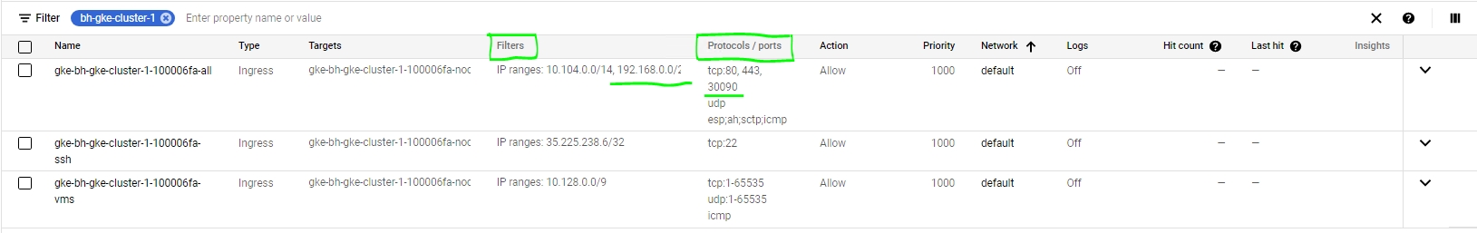 Here is an example to check firewall rules on the Google GKE cluster: