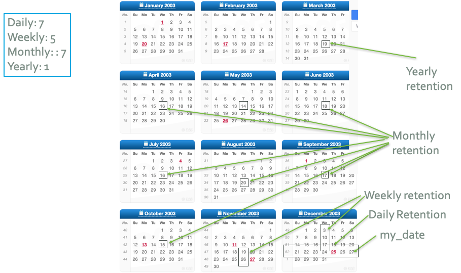 You can define retention policies by number of yearly backups, monthly backups, weekly backups and daily backups. The above diagram explains how the backup/snapshot retention works in Trilio. Same is applicable to Snapshot feature as well.