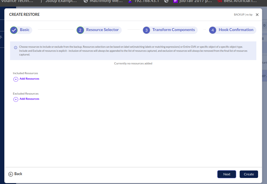 If your backup contains 10 deployments but you only want to restore one, you can use the IncludeResources section to select and restore just that specific deployment. Resources can be defined using either a labelSelector or a gvkSelector (Group, Version, Kind, Name).