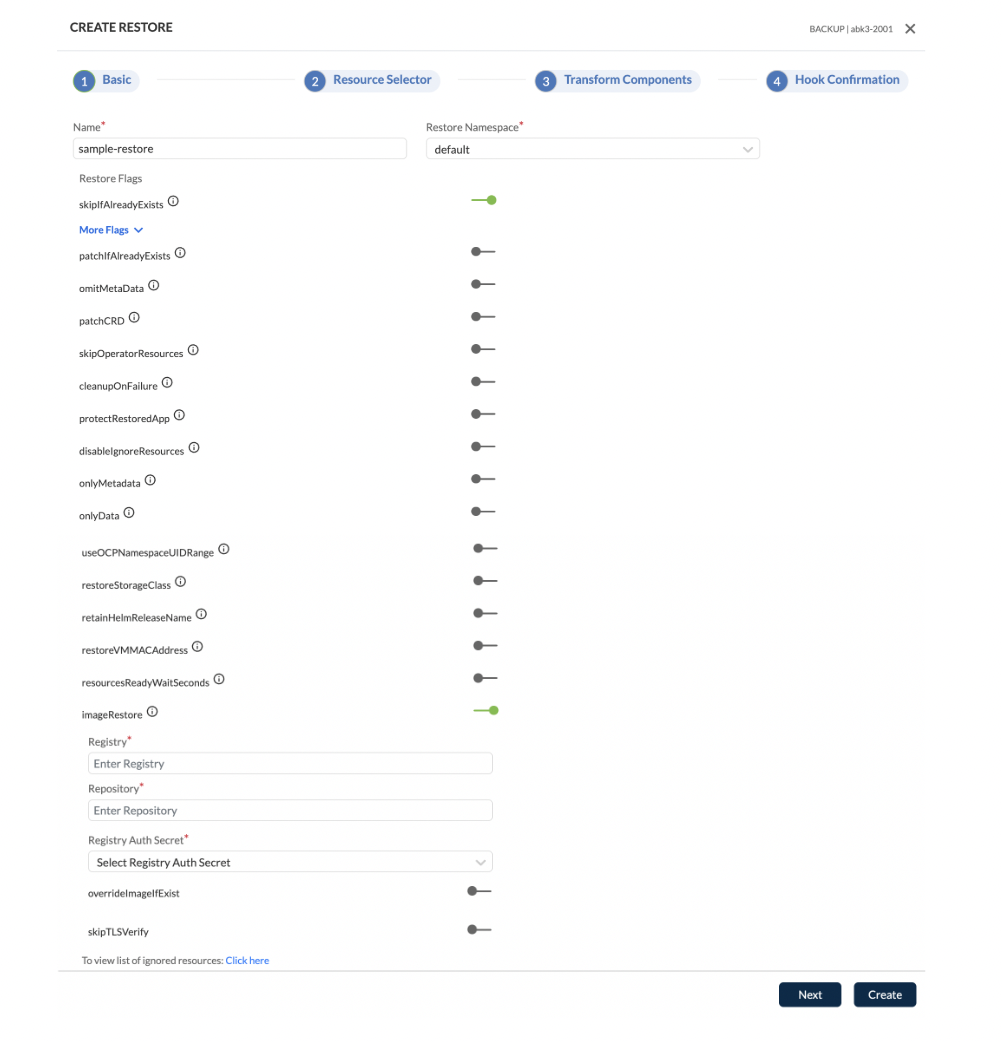 2. If the user already has the images in the restore registry with the same name but the image is different. We, by default, generate a new tag for the restored image. If the user wants to override the existing image, he can enable restoreFlags.overrideImageIfExist.