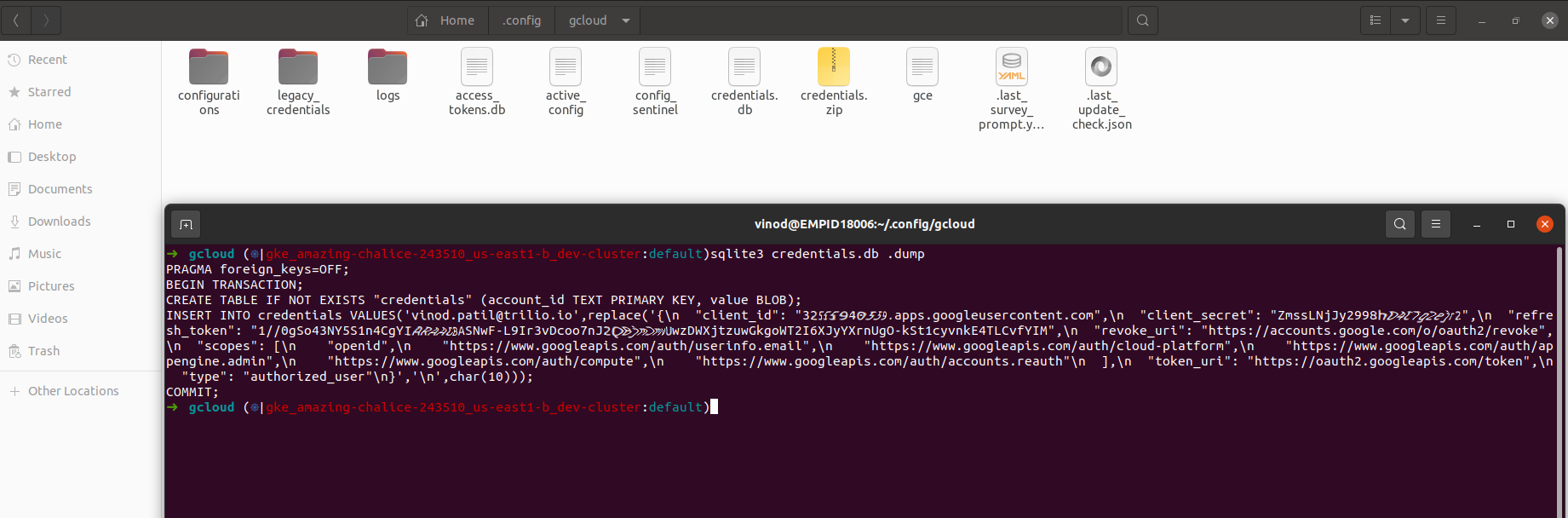 1. In a GKE cluster, a local binary known as gcloud is used pull the credentials from a sqlite credentials file named credentials.db.