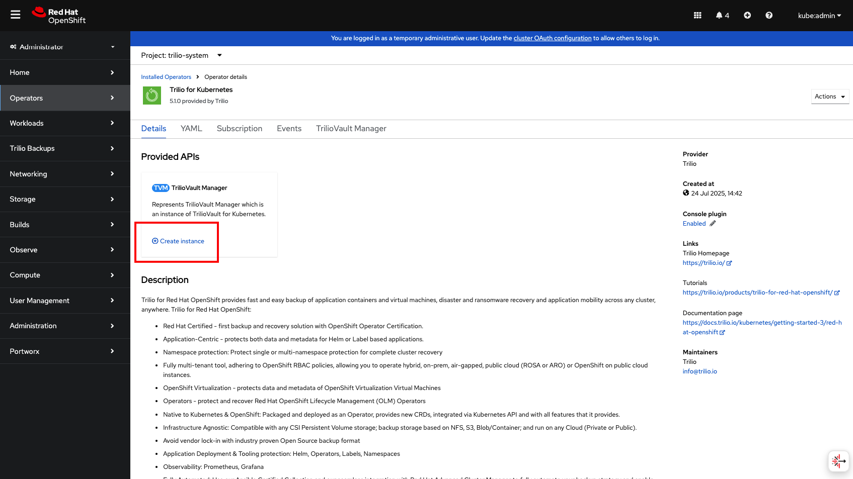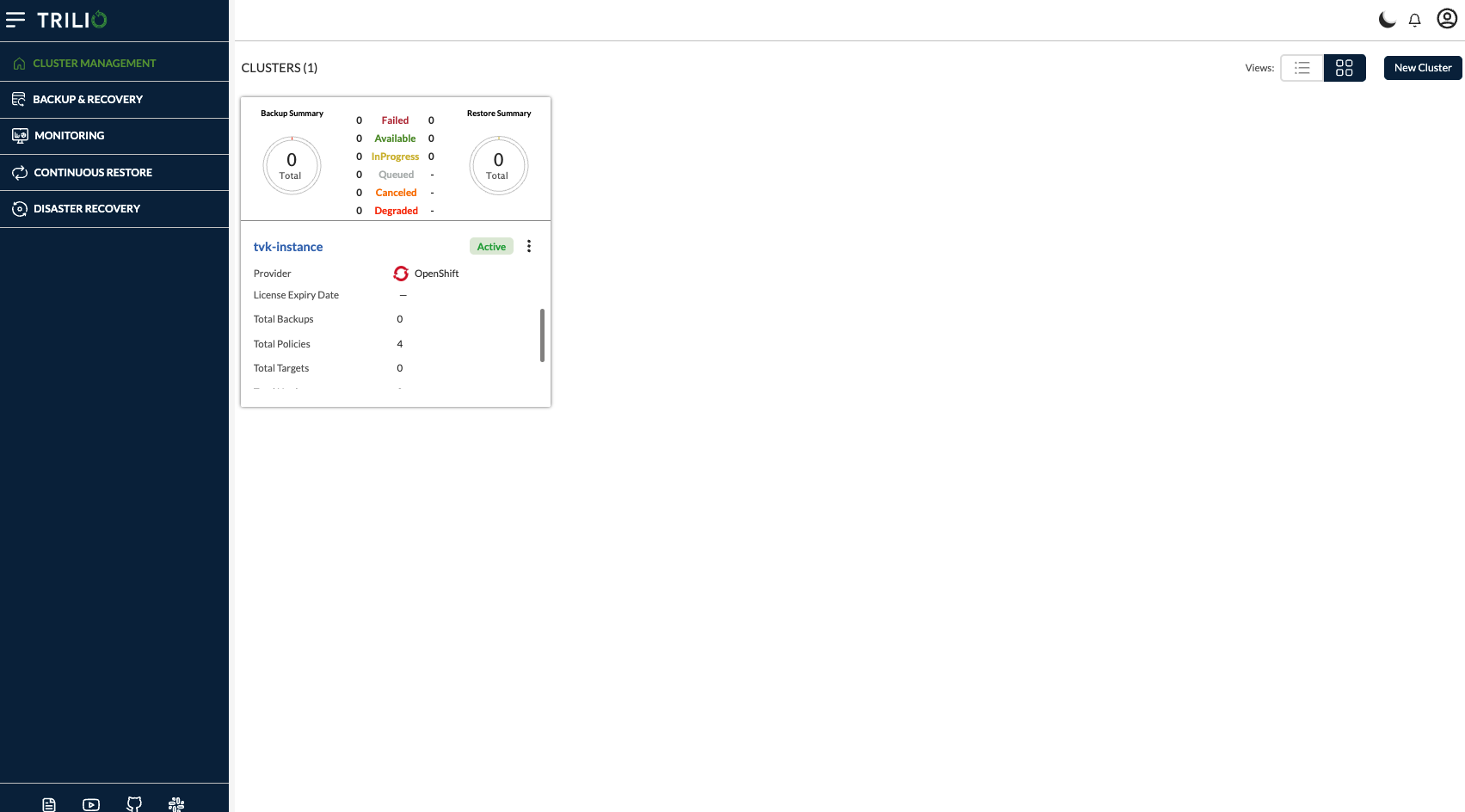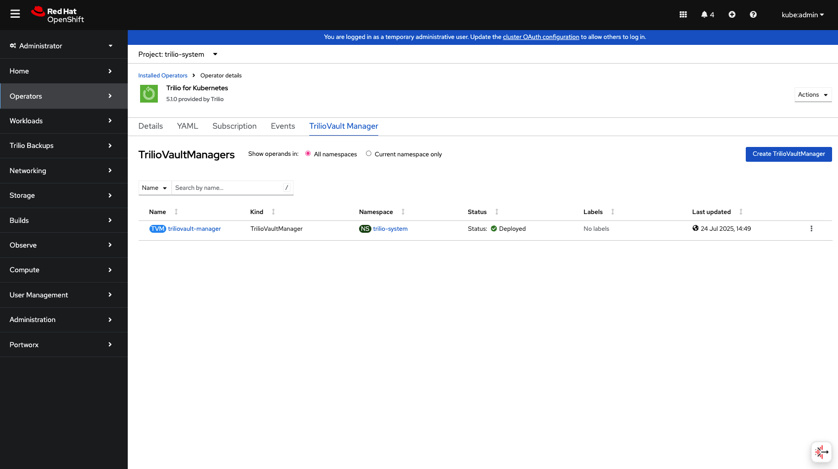 Trilio for OpenShift is a cloud-native backup and restore application. Being a cloud-native application for Kubernetes, all operations are managed with CRDs (Customer Resource Definitions).