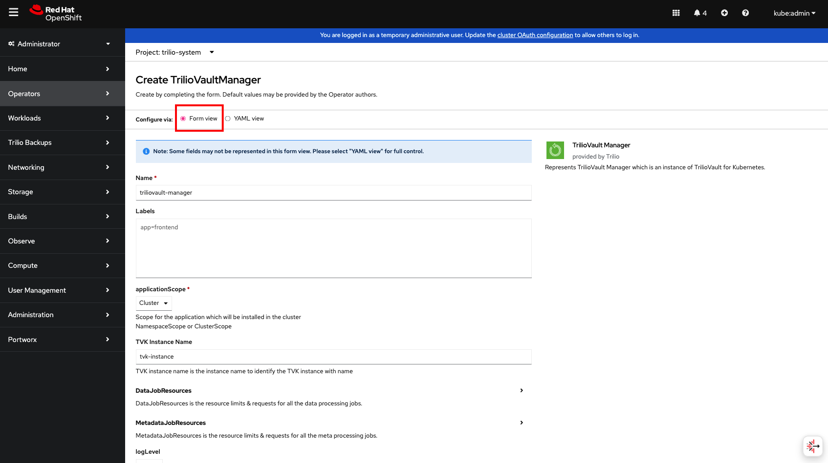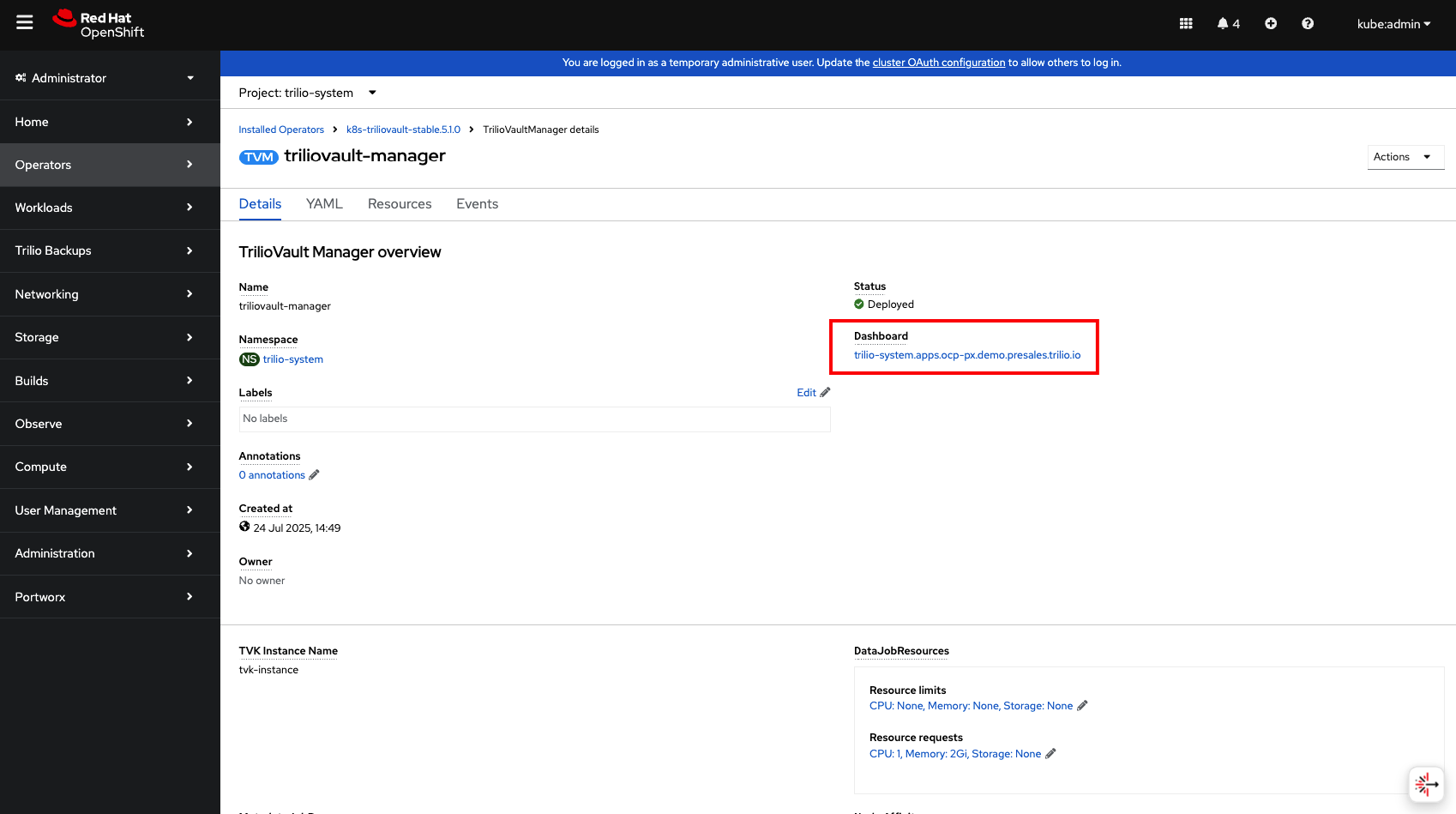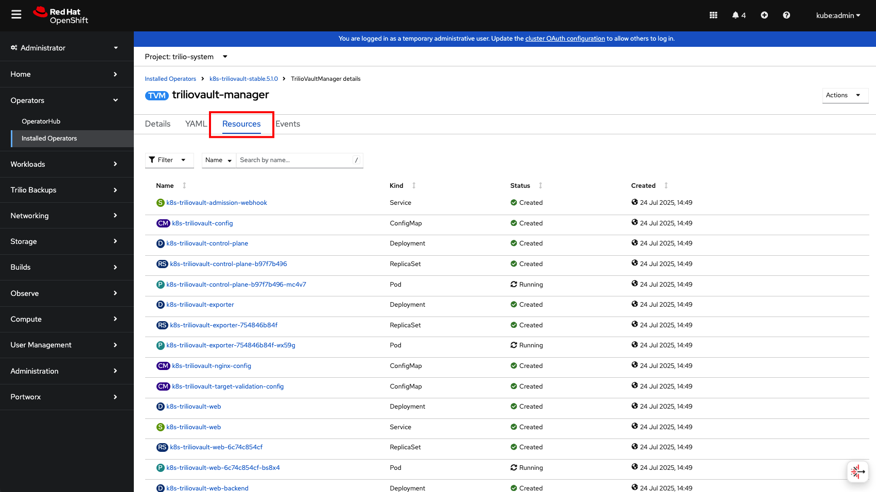 Trilio for OpenShift is a cloud-native backup and restore application. Being a cloud-native application for Kubernetes, all operations are managed with CRDs (Customer Resource Definitions).