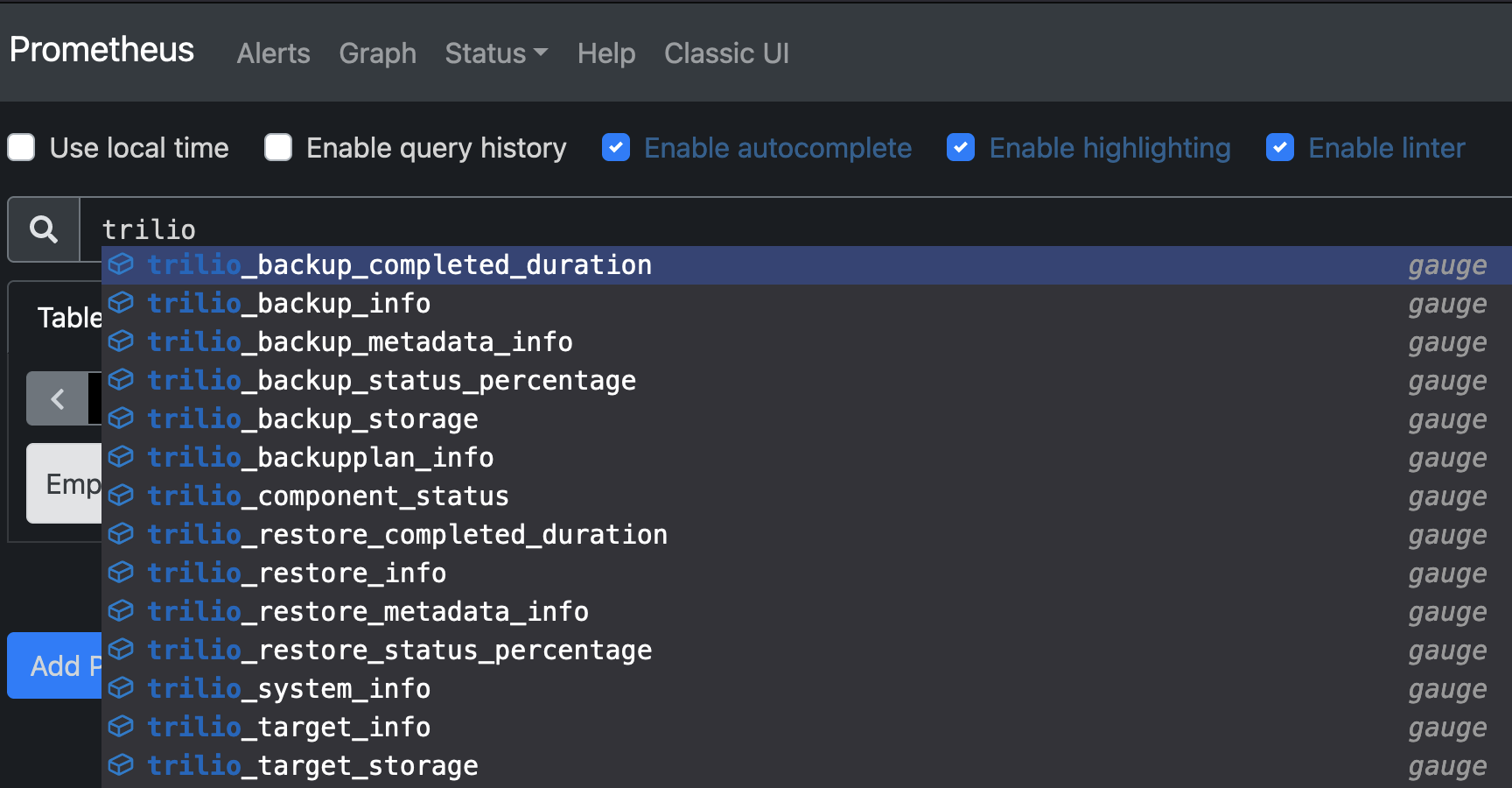 * [x] After you have created the required objects in your cluster, wait for a few minutes before checking for Trilio metrics on the OpenShift native Prometheus UI by entering a string literal of "trilio" in the Prometheus query field.