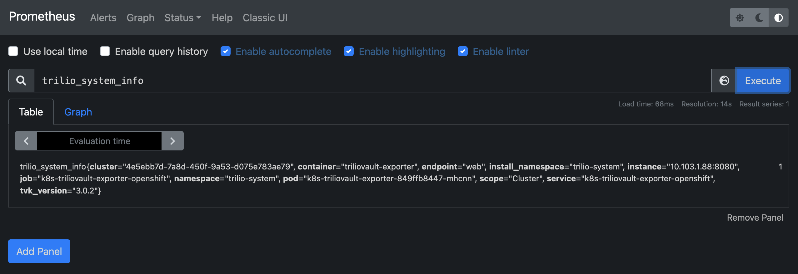 Select the metric *trilio\_system\_info* and click the "Execute" button. You should see the table beneath the query field populate with data if the Trilio Exporter is being scraped as expected.
