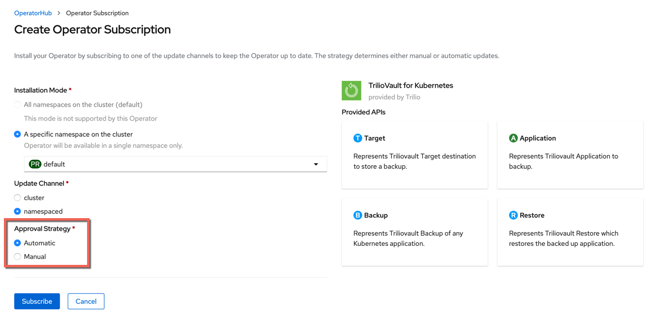 When installing the Trilio Operator, the cluster admin can specify how to update via an approval strategy - either manual or automatic.