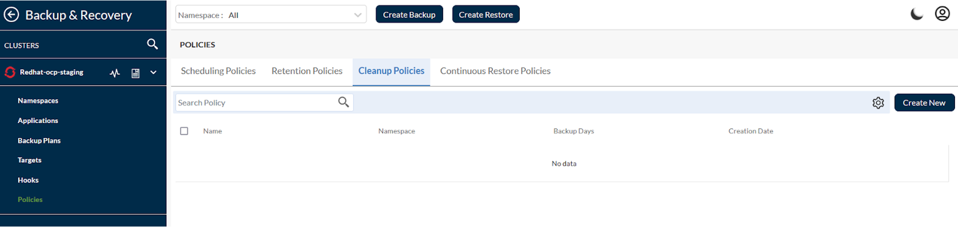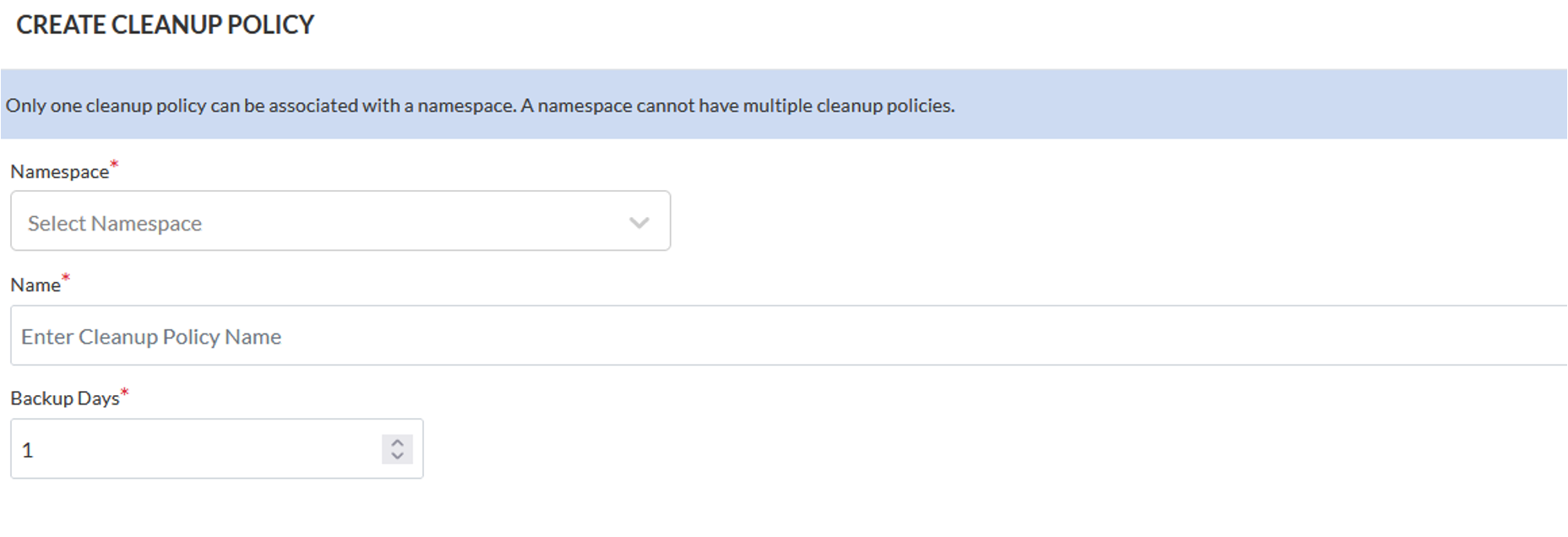 This action creates the cleanup policy for the given namespace. Users may have to repeat the steps for each namespace. However, to define a cluster-wide cleanup policy, please refer to the [cleanup policy.](https://docs.trilio.io/kubernetes/getting-started/getting-started-1/triliovault-crds#cleanup-policy)