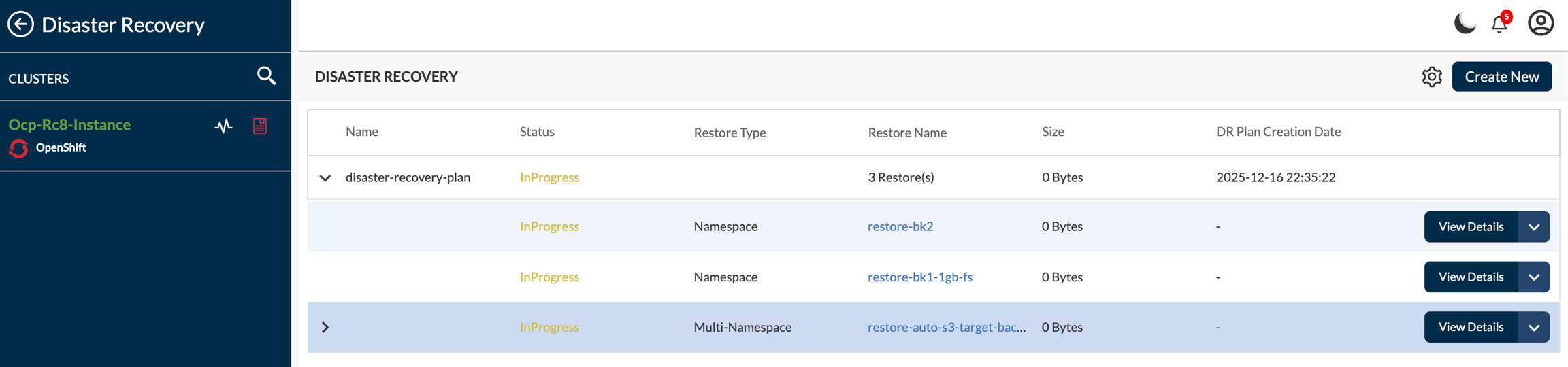 Users can monitor the status of the DRPlan from the resource management tab itself and can look at the status of individual restores from the restore overview page.
