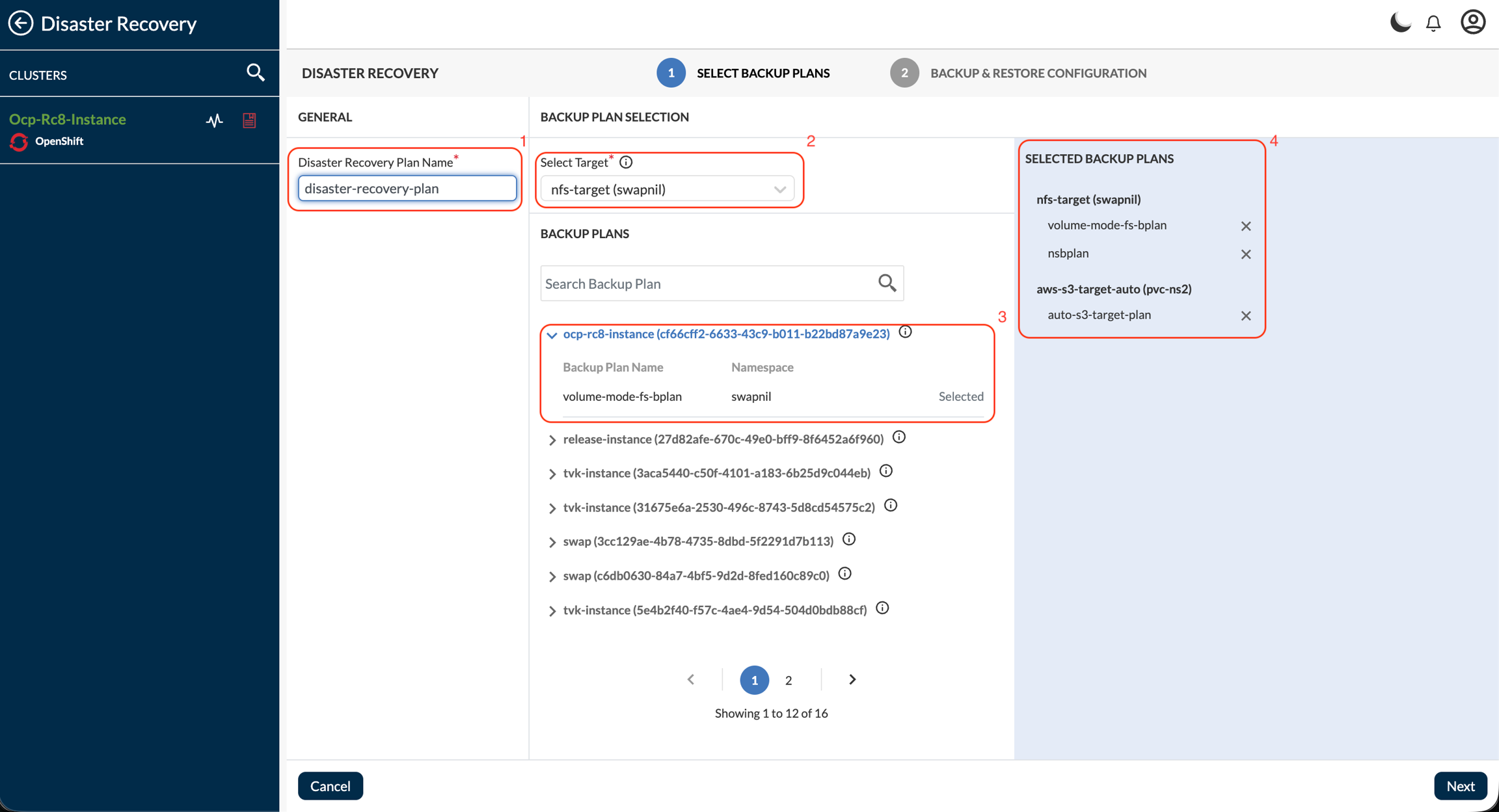 Select one or more backup plans from the available plans in the selected target. You can select backup plans from multiple targets to create a comprehensive DR plan that restores multiple applications or namespaces as part of a single workflow. In the accordion view, the Instance ID and the instance name where the backup plan is or was present are displayed.