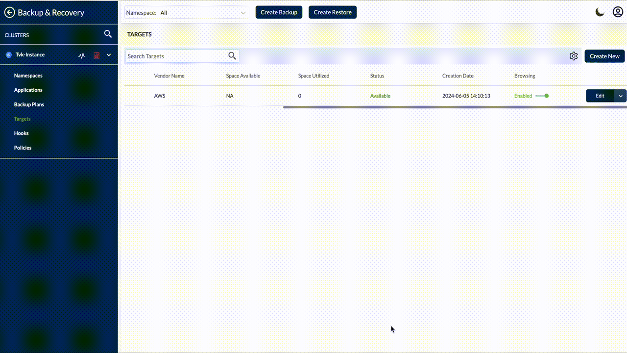 User can initiate the Restore from Namespace section if the Namespace has Available Backup or Snapshot\