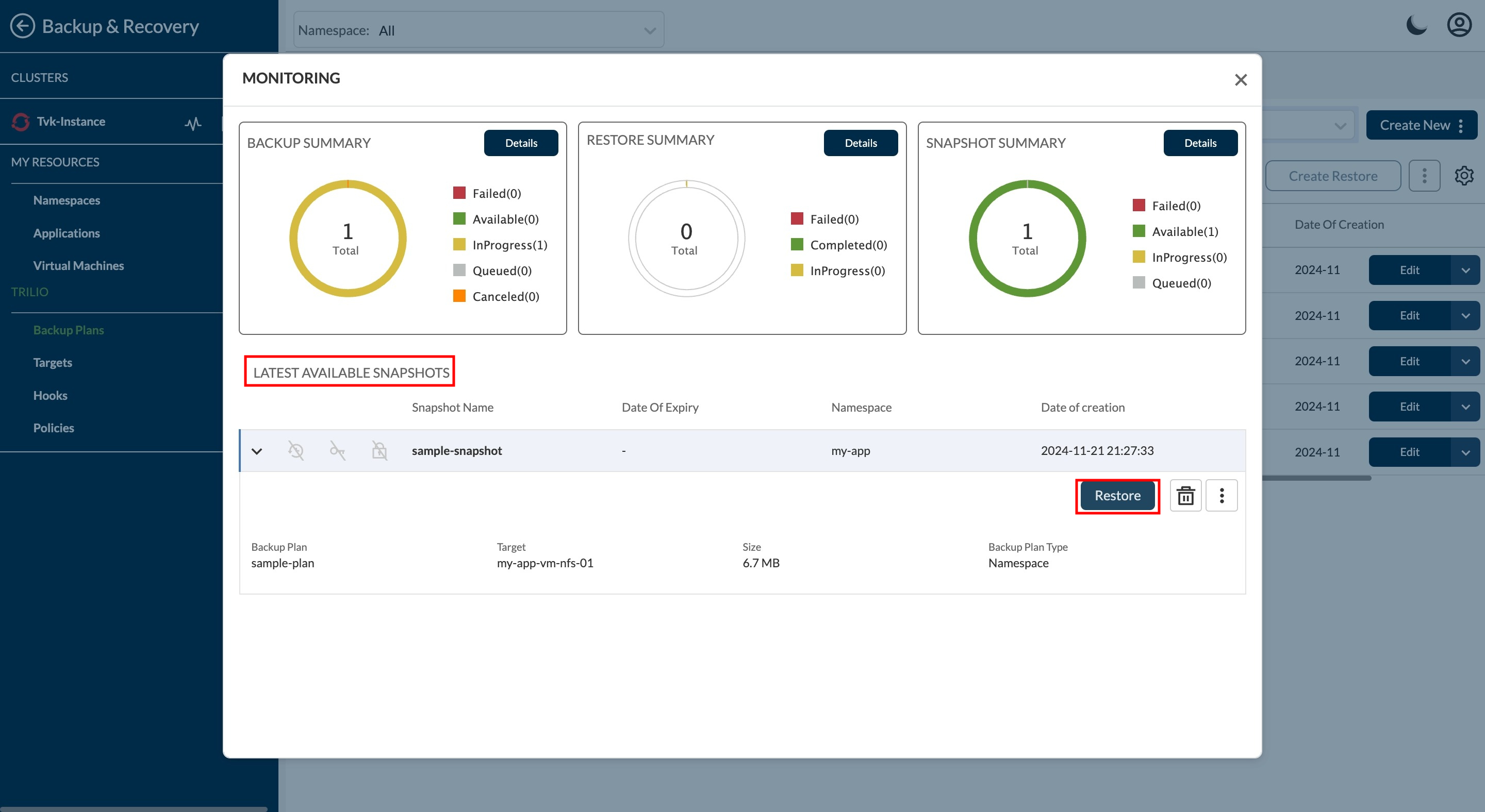 User redirect to the Monitoring model pop-up by clicking on View Backup & Restore summary from action item from Namespace and Backup plan section. From here user can initiate a Restore for specific Backup or Snapshot.
