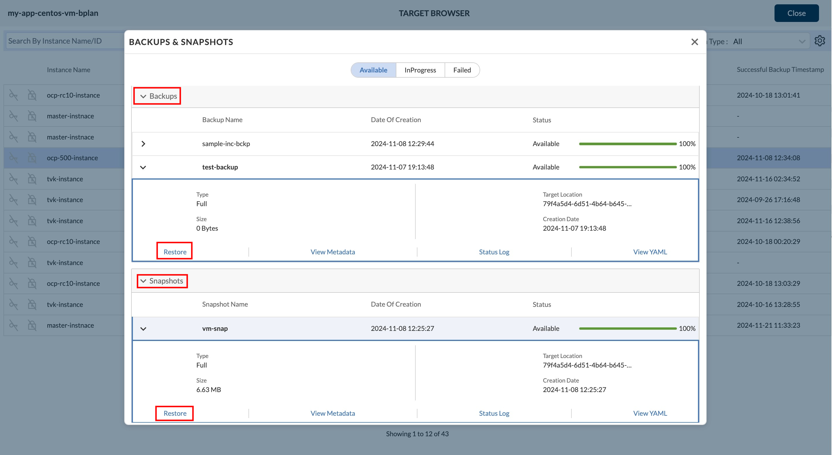 Users have the ability to restore a backup and snapshot, view metadata, view status log, or view the YAML of the backup and snapshot directly from the target. This is no different than how a user would interact with a backup and snashot reference that is available locally, hence keeping the experience the same.