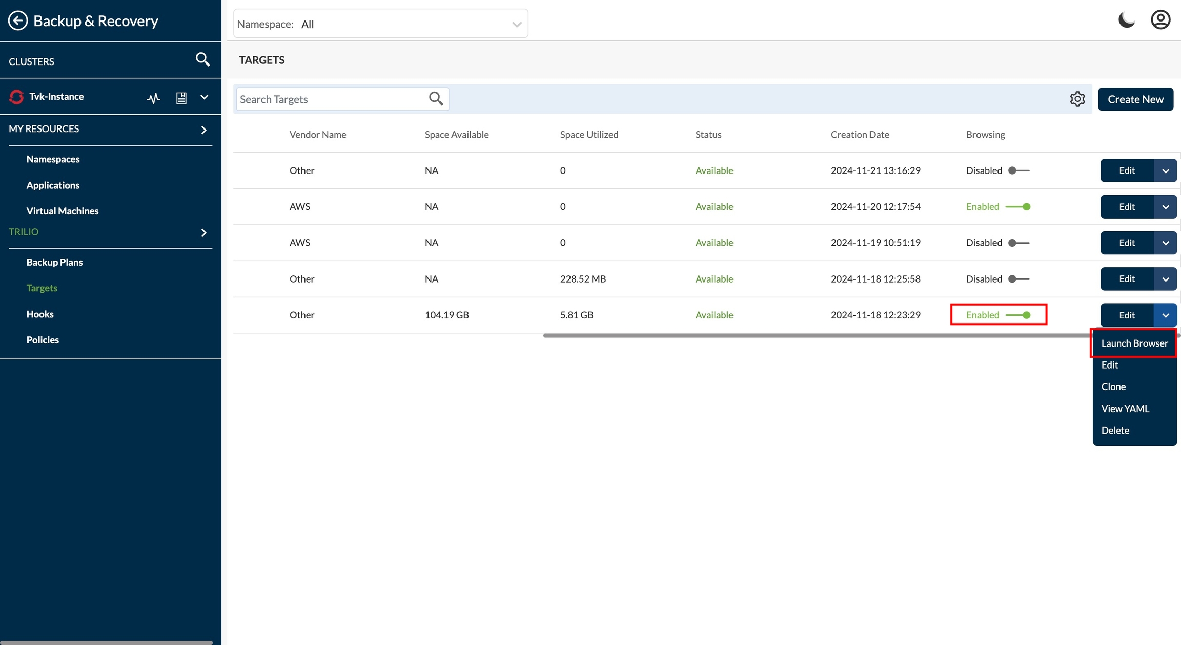 Target browsing can be enabled by using the toggle switch provided within the target page next to each target. Once browsing has been enabled, a target browser pod is spun up in the namespace the target resides that enables the user to browse through the data present on the target via the management console. The enabling process can take a couple of minutes to become ready.