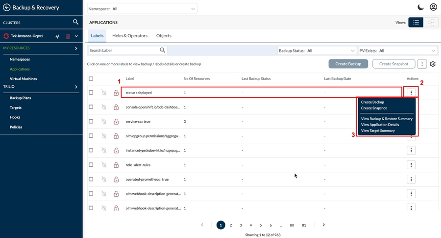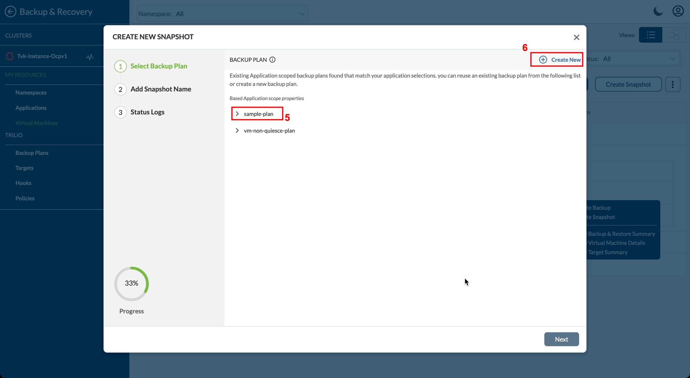 Create Snapshot - Select Backup plan If no existing plan is suitable, select Create New and follow the instructions in Backup Plan - Single Namespace. Note that if user create a new backup plan, it may take some time before it becomes available. Once the new backup plan becomes available, select it and proceed.