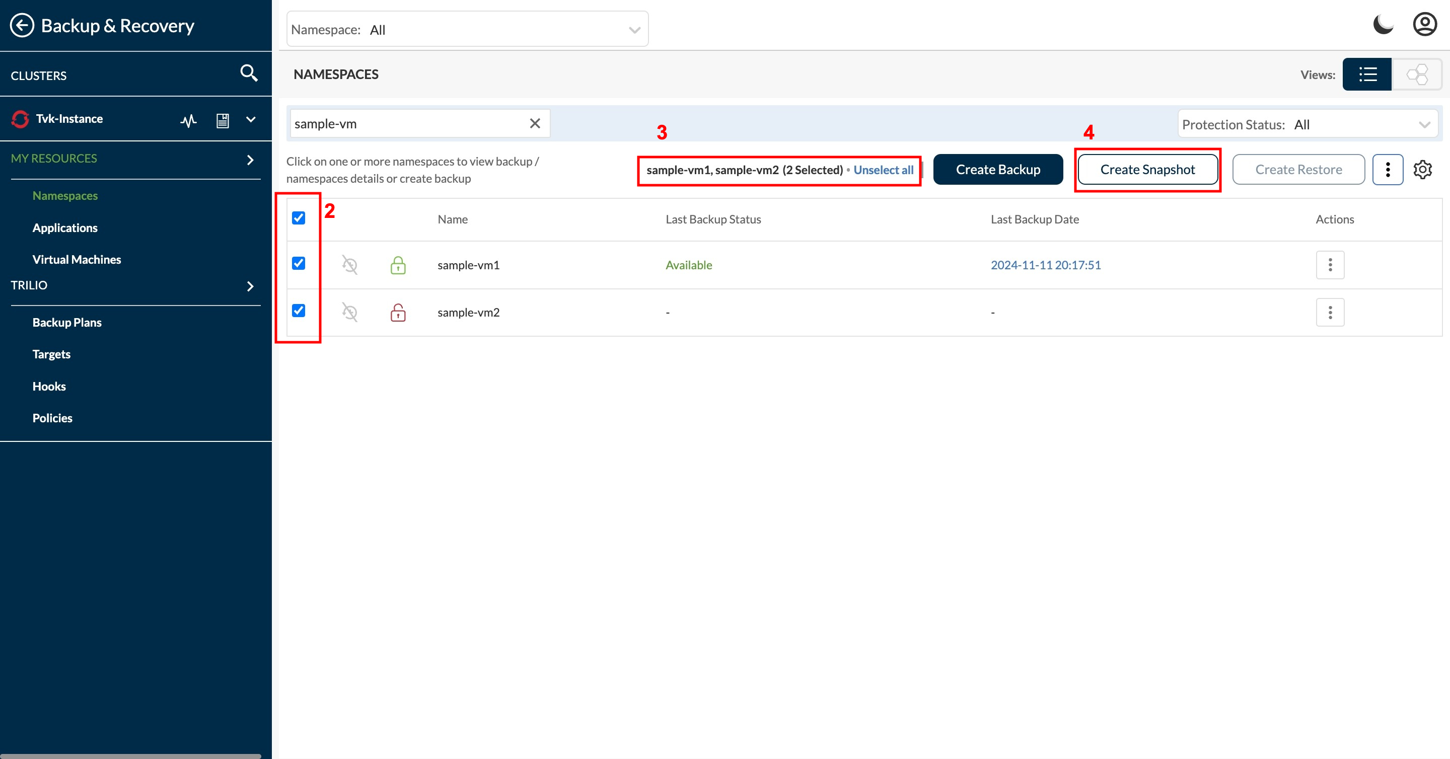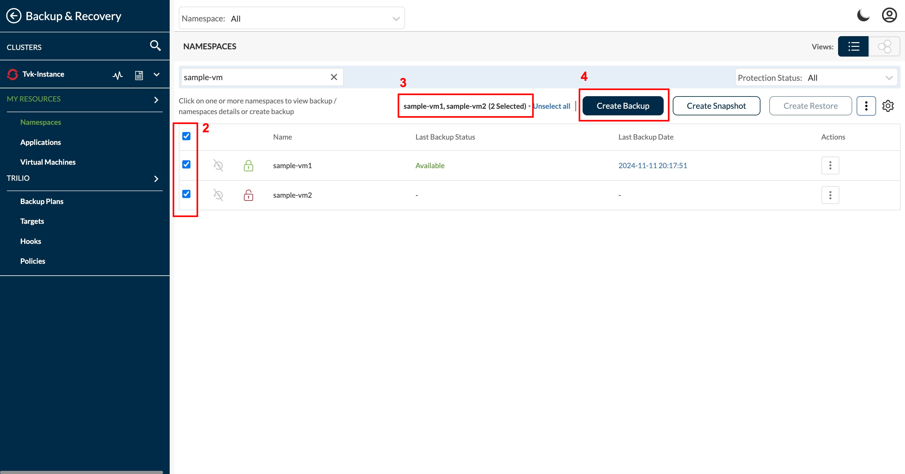 1. From the Backup & Recovery's **Namespace** page, identify the listed namespaces for which you wish to perform an action.