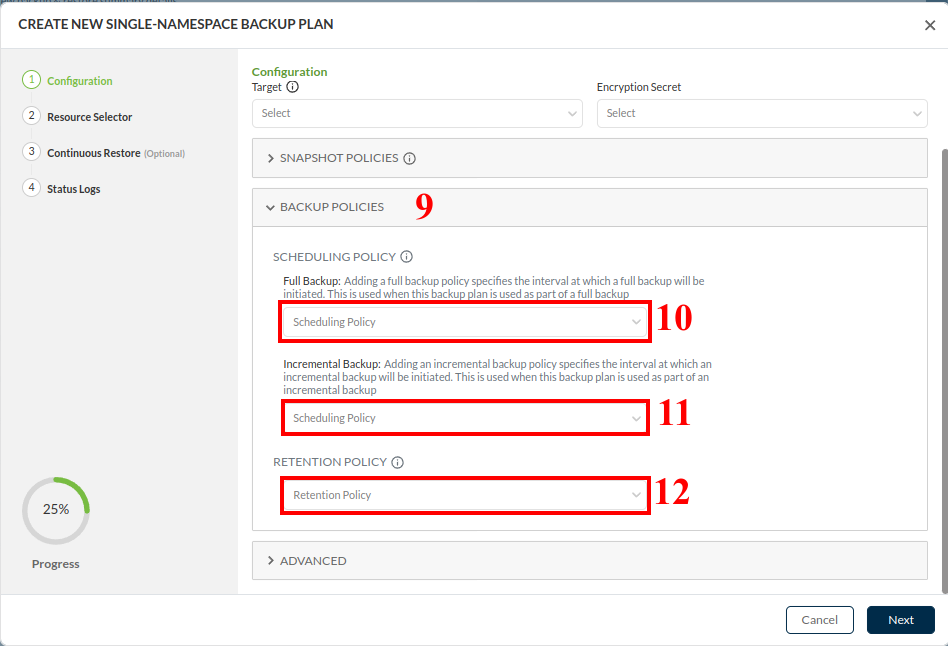 10. **Scheduling Policy** : **Full Backup** this schedules the backup based on the policy selected, when this plan is part of full backup.