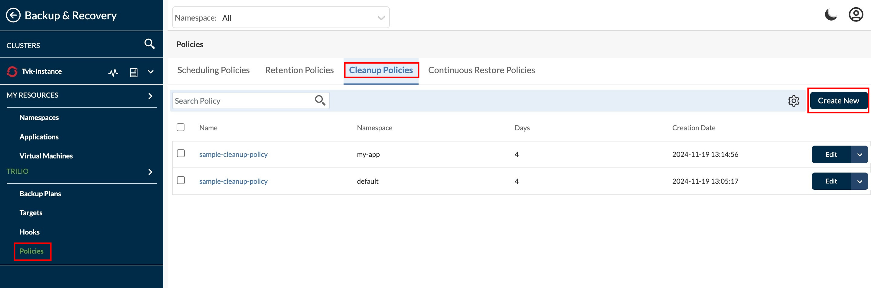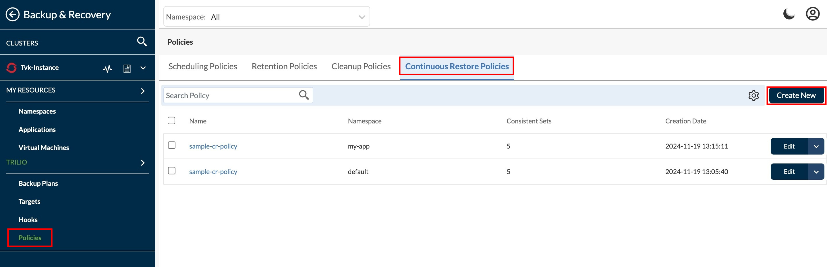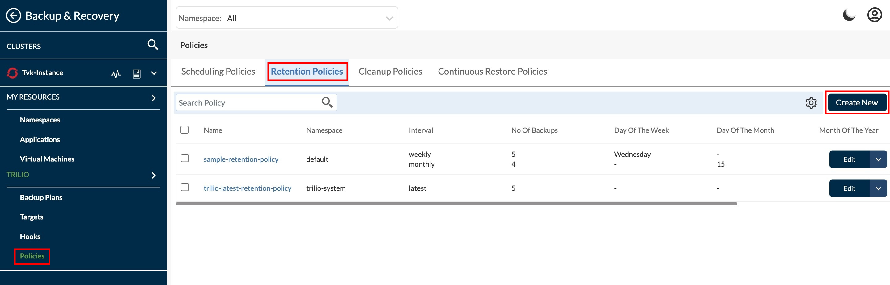 Redirect to Policies page under Backup & Recovery section. To create a new policy click on **Create New** from right side upper corner.