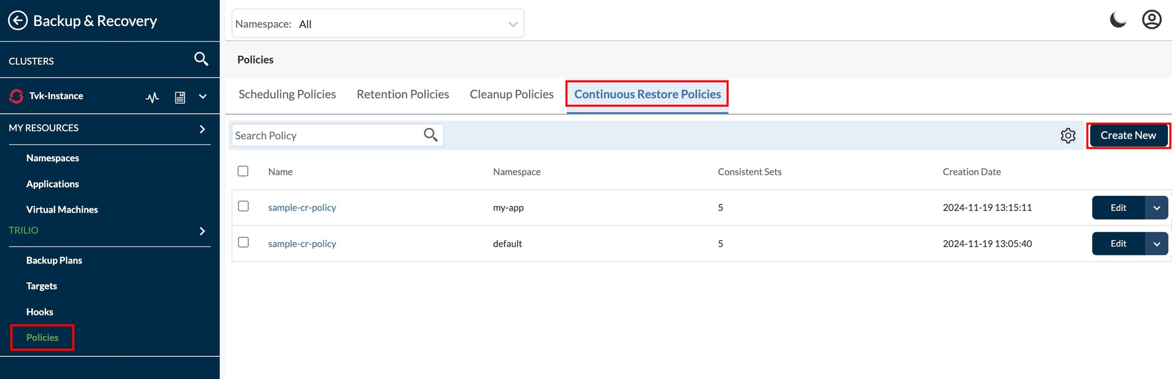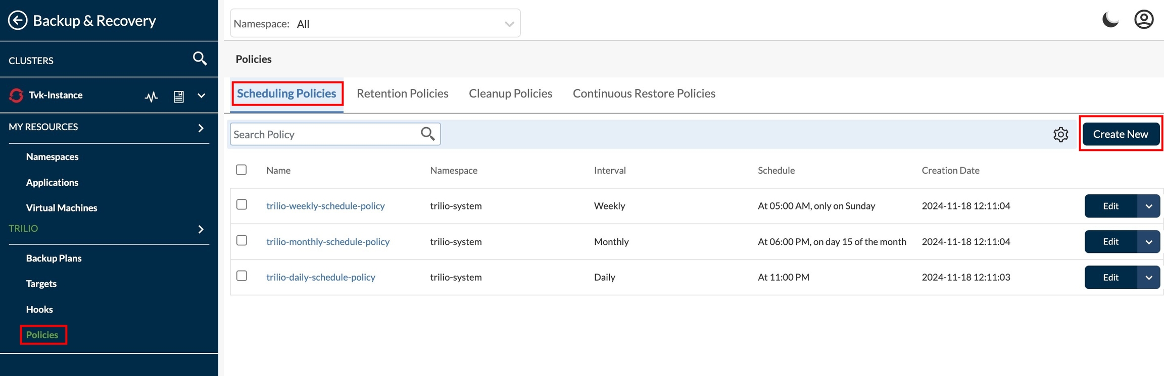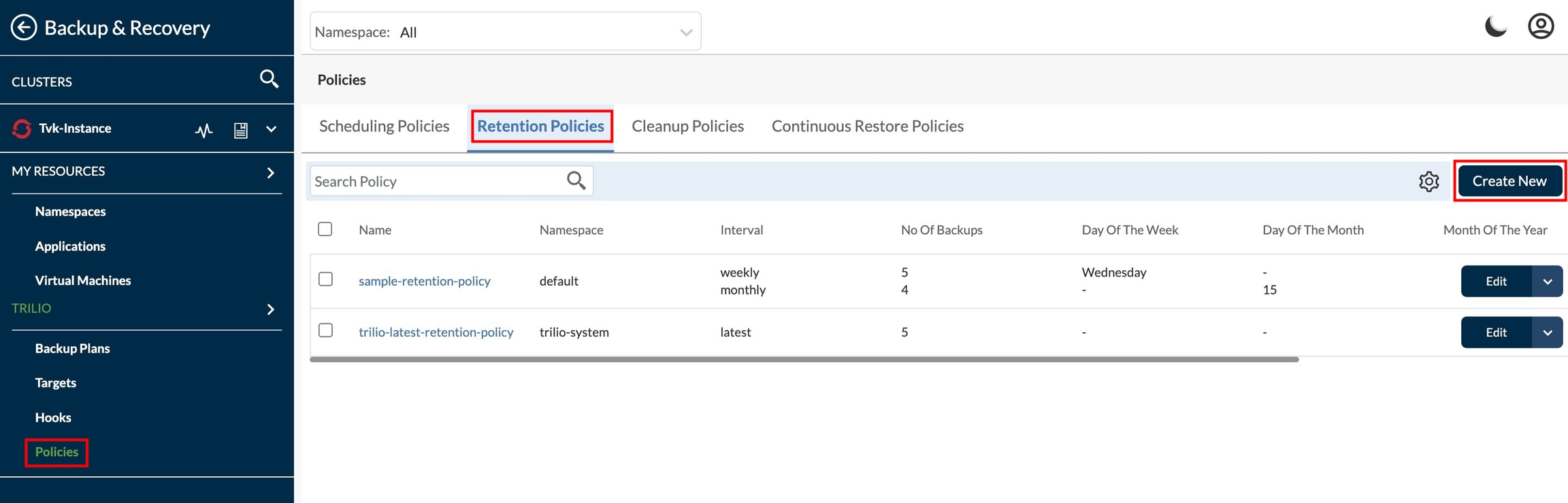 Redirect to Policies page under Backup & Recovery section. To create a new policy click on Create New from right side upper corner.