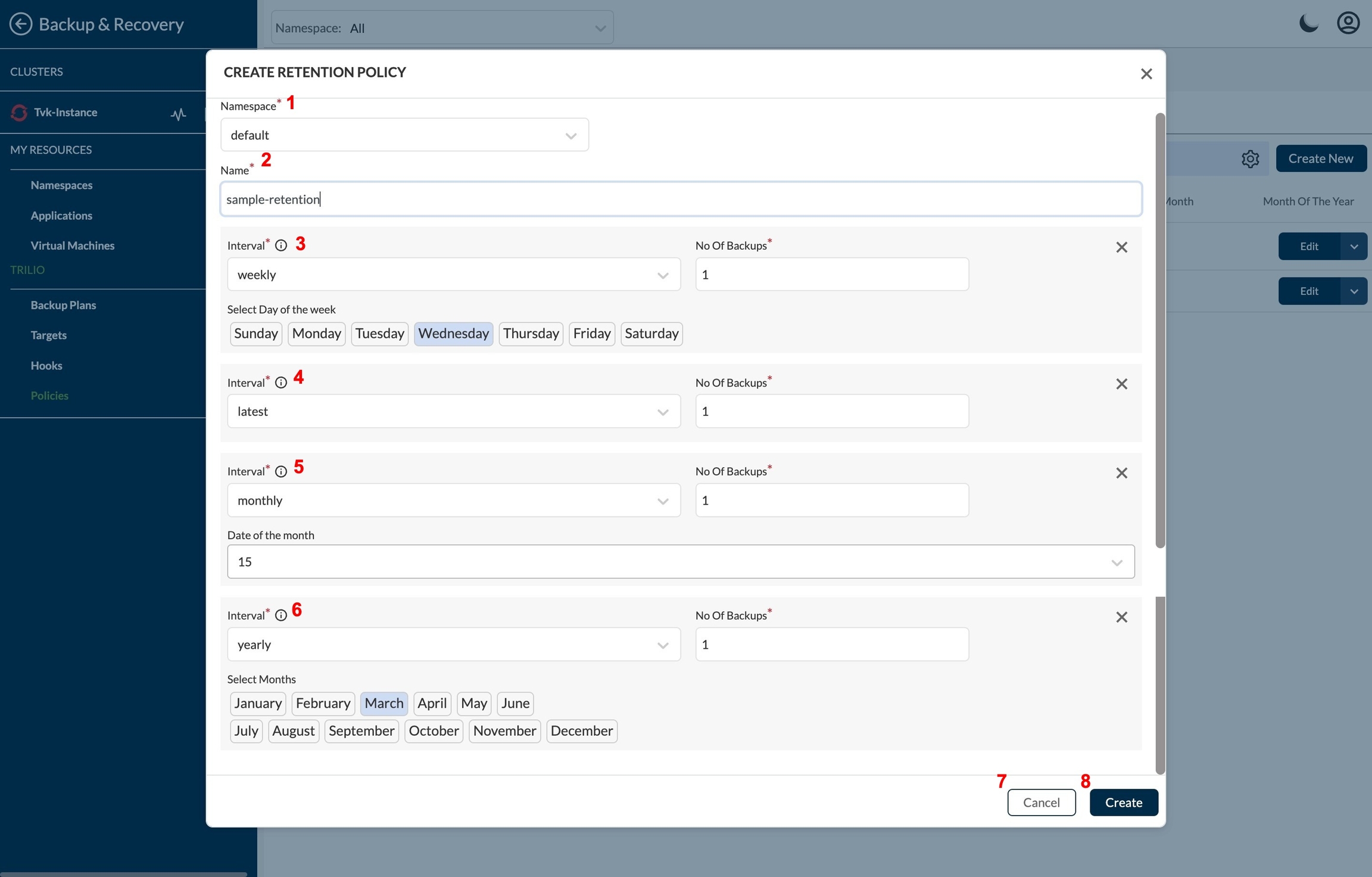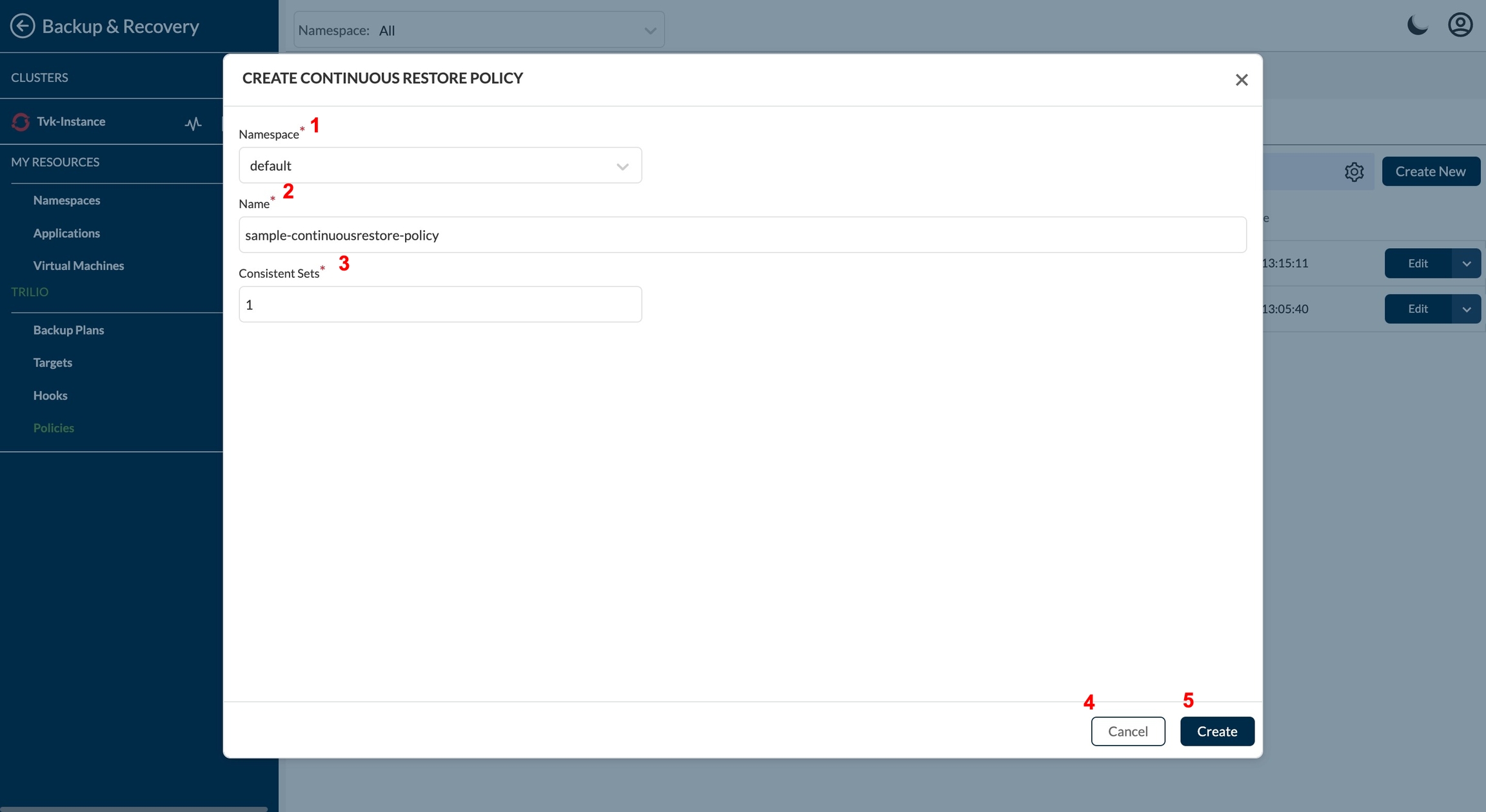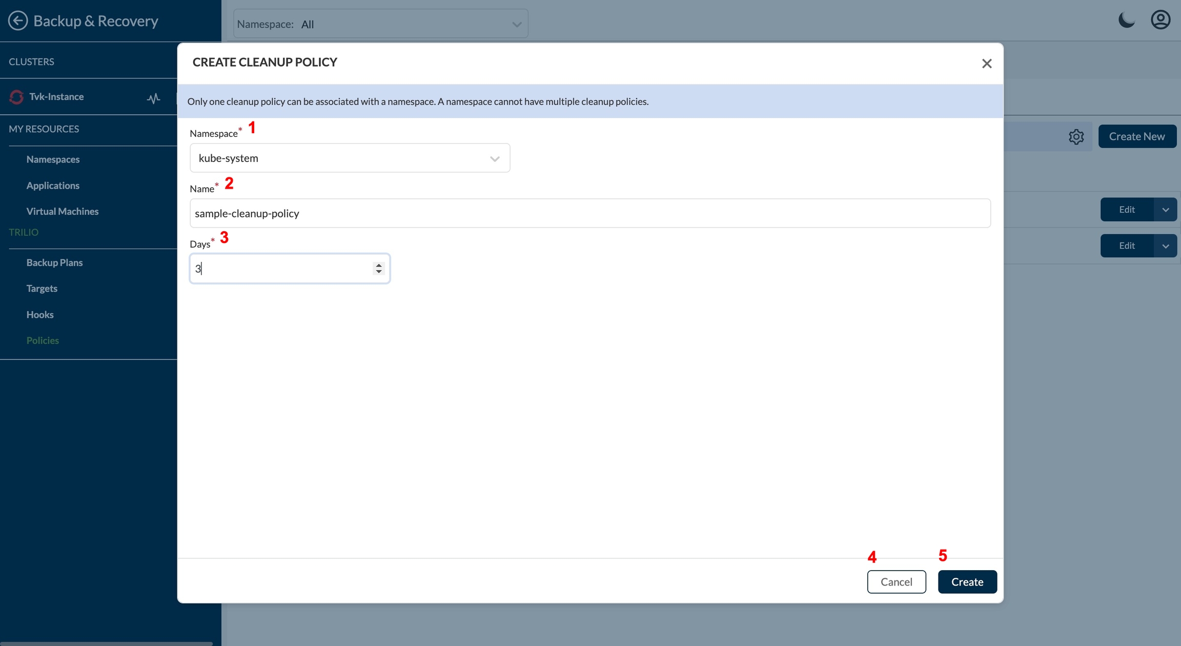 Redirect to Policies page under Backup & Recovery section. To create a new policy click on Create New from right side upper corner.