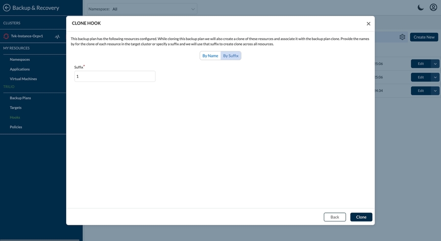 Click on the Clone button after selecting the namespaces to move to next step.Policy name by "By Name" - Here, the user can set a name for the cloned policy by a text.