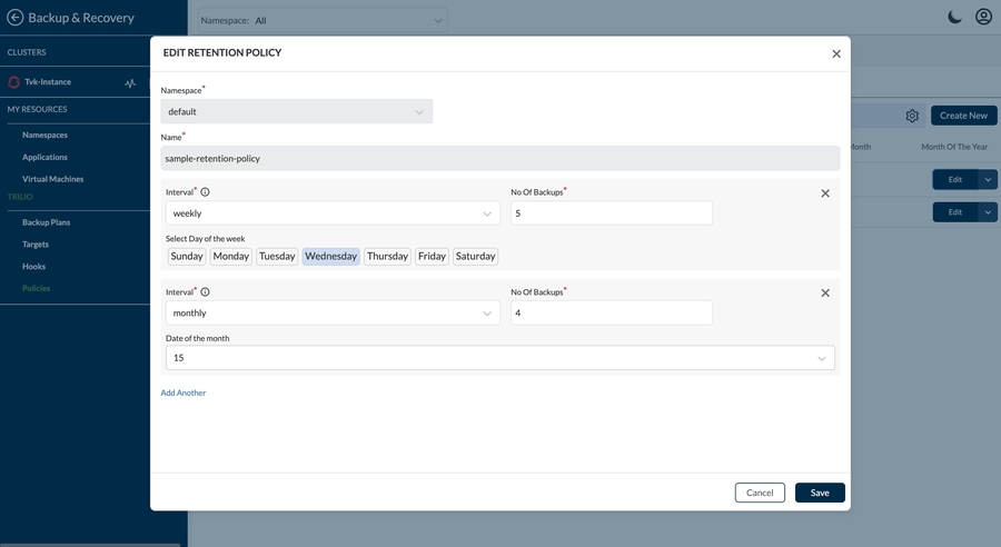 Edit Retention policy page
