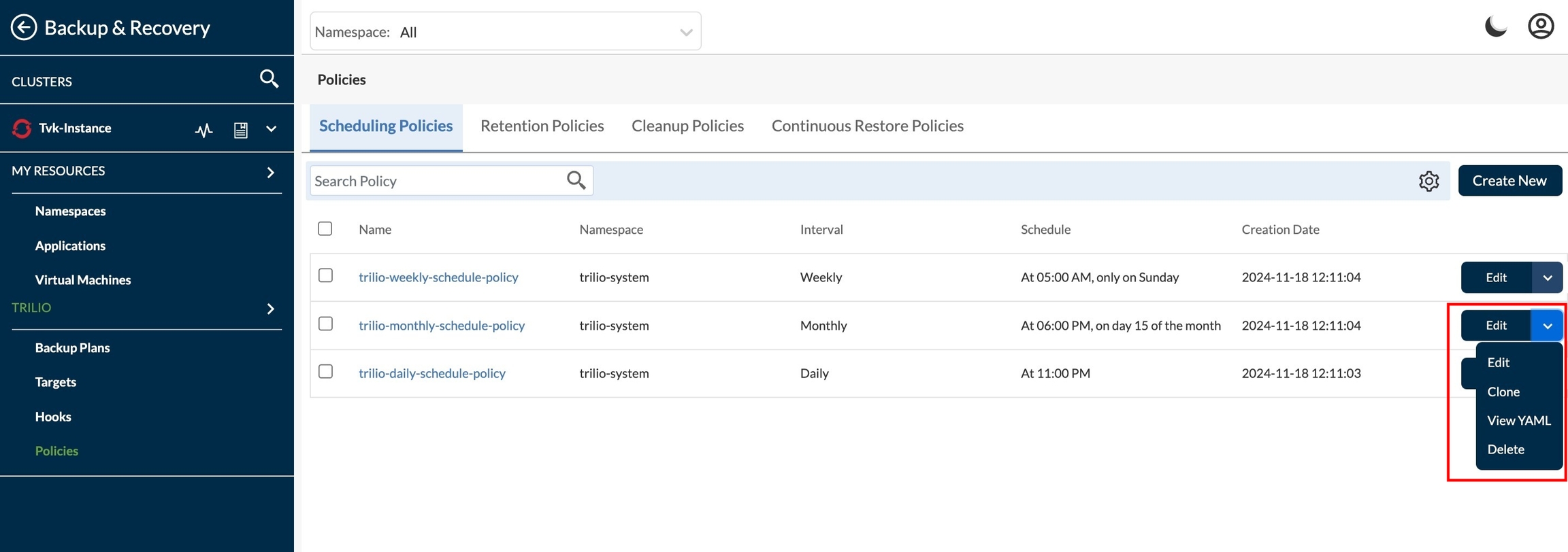 Edit action - This edits the existing policy. Apart from Namespace and Name user can edit all other fields.