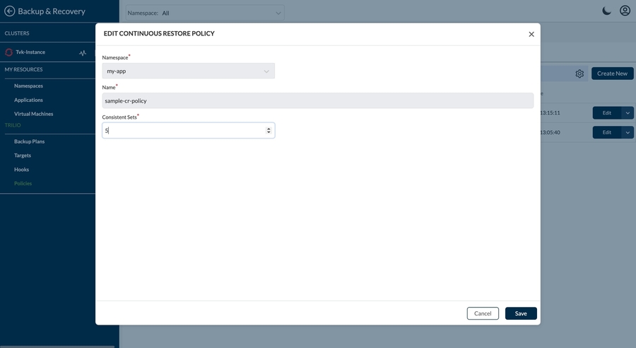 Edit Continuous Restore policy page