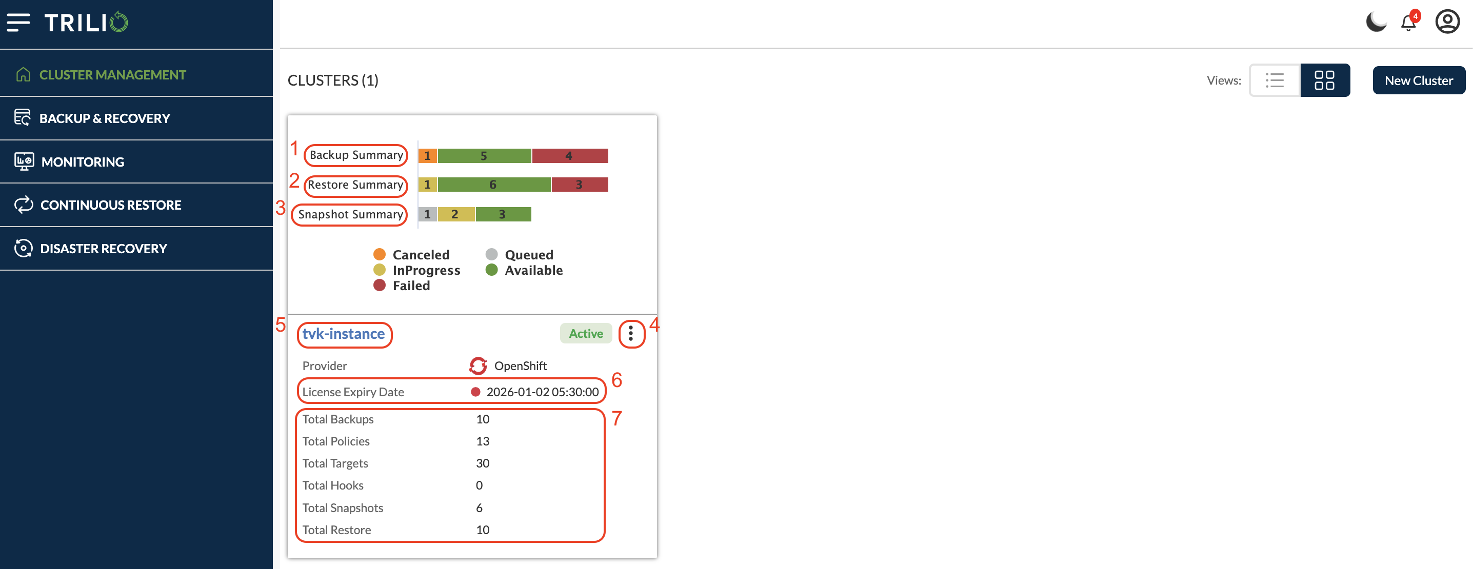 <table><thead><tr><th width="70">Field No.</th><th width="150">Field/Button Name</th><th>Description</th></tr></thead><tbody><tr><td>1</td><td>Backup summary</td><td>This section presents a summary of the backups which shows the number of backups in each status category.</td></tr><tr><td>2</td><td>Restore summary</td><td>This section presents a summary of the restore which shows the number of restores in each status category.</td></tr><tr><td>3</td><td>Snapshot summary</td><td>This section presents a summary of the snapshots which shows the number of snapshots in each status category.</td></tr><tr><td>4</td><td>Actions</td><td>Pressing the <strong>Actions</strong> button displays a dropdown menu of actions that a user can take in relation to the cluster selected. For more details click <a data-mention href="#actions">#actions</a>.</td></tr><tr><td>5</td><td>Instance name</td><td>This is the name that you have given to your added cluster. These names should always be meaningful, so that a user can instantly recognise one cluster from another.</td></tr><tr><td>6</td><td>License Expiration Date</td><td>A valid Trilio license is required for running backups and it must be available on the system before a scheduled or on-demand backup is triggered. Once a license expiration date is reached, access to previous backups (made with a valid license) is still available. However, no further backups can be made, which creates risk for the user.</td></tr><tr><td>7</td><td>Total</td><td>This shows total number of available resources on the Cluster</td></tr></tbody></table>
