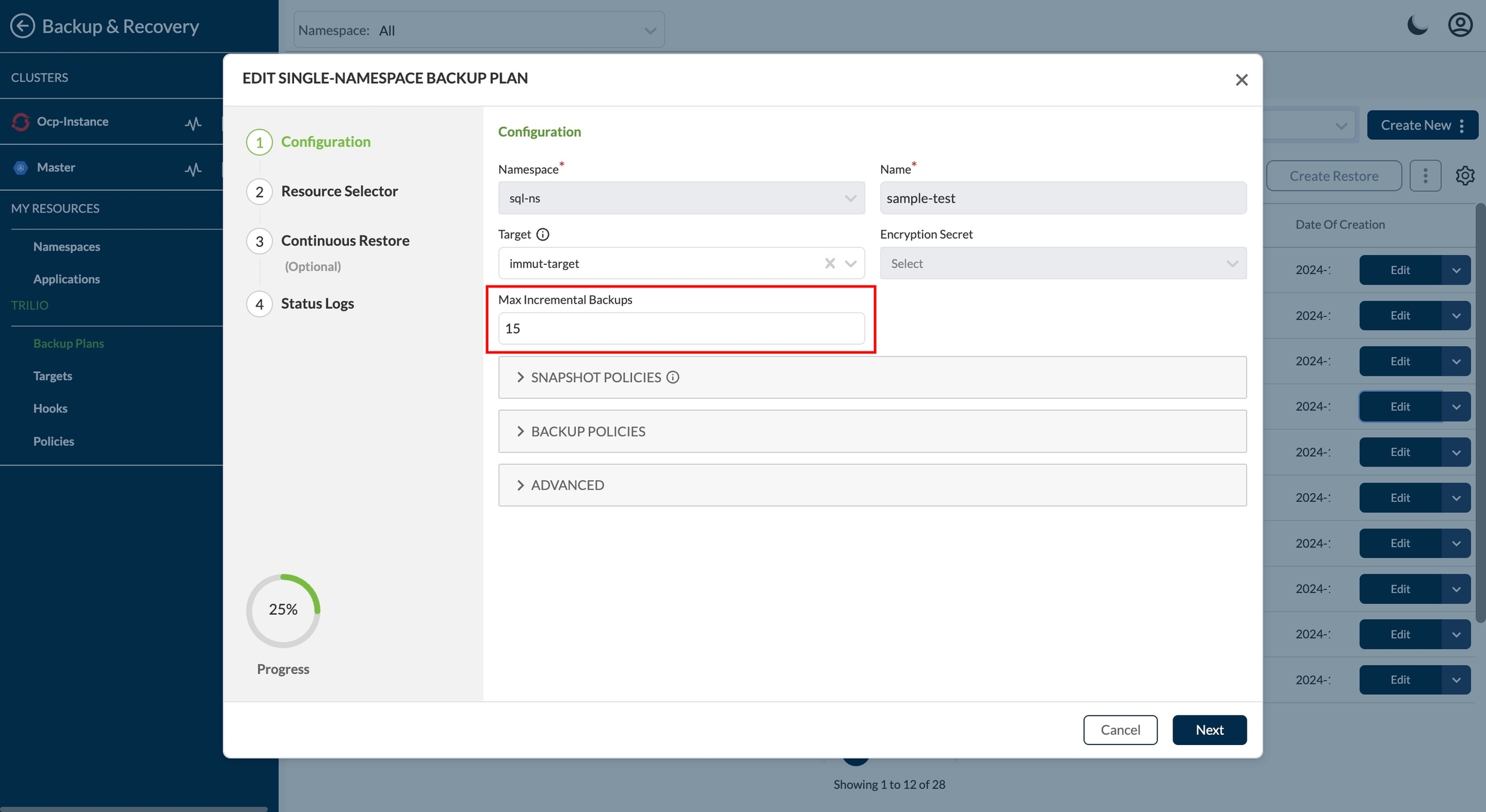 Immutable backups can not take "forever" incremental backups as we can with standard Trilio backups. Each immutable backup has a set number of incrementals to be taken, with the backup expiring at the conclusion of the last backup in the chain. Trilio has introduced a field MaxIncrBackupsPerFullBackup which represents the total number of incremental backups taken in the chain, after which a new full backup is created so that we can slowly retire the old backups we have written on the immutable target storage.
