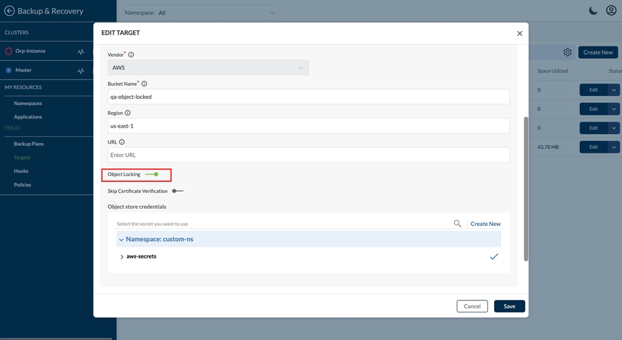 Trilio supports immutable backups on Object store targets which have object locking and versioning features enabled. For AWS S3 buckets, you can follow these steps to enable object locking. Trilio utilizes the underlying locking capabilities of the object store to create immutable backups which cannot be altered by users or the Trilio retention process.